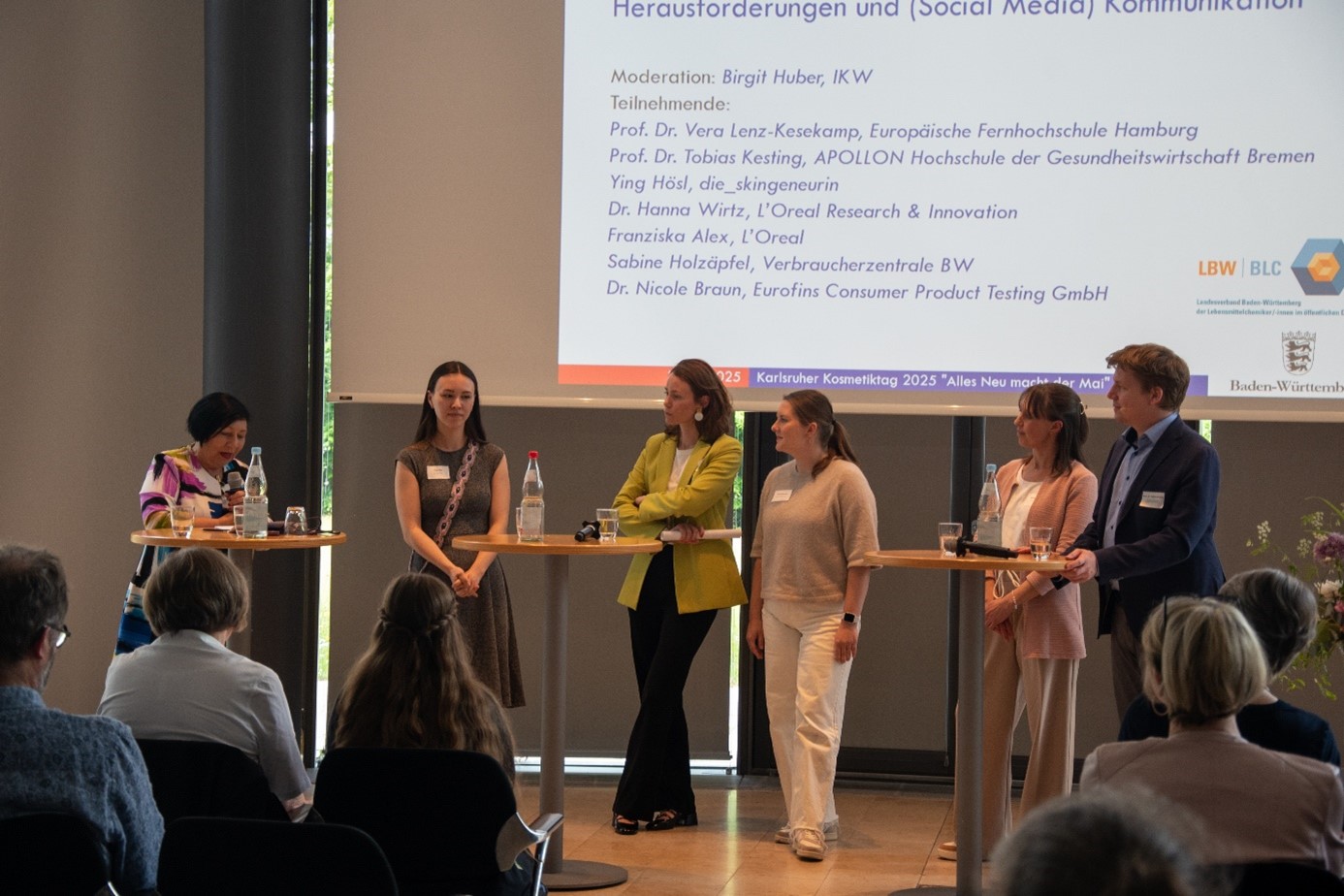 Der erste fachliche Teil des KKT beschäftigte sich mit der Frage, wie sich die Kosmetikbranche im digitalen Zeitalter wandelt und welche Rolle Social Media dabei spielt. Prof. Dr. Tobias Kesting präsentierte einen mit Prof. Dr. Vera Lenz‑Kesekamp ausgearbeiteten Vortrag über virtuelle Influencerinnen und Influencer und deren Bedeutung für die Kosmetikbranche im Kontext der digitalen Transformation, wobei sowohl Chancen als auch Risiken behandelt wurden. Darauf folgte Influencerin Ying Hösl mit Einblicken in Kosmetikmythen, Trends und Sorgen auf Instagram, unterstützt durch Videobeiträge von Ann-Kathrin Ortmann, die auf die Verbreitung von Fehlinformationen aufmerksam machten. Dr. Hanna Wirtz zeigte, wie globale Unternehmen Social Media und Technologien wie KI nutzen, um Konsumenten innovative und personalisierte Beauty-Erlebnisse zu bieten. Sabine Holzäpfel stellte die Herausforderungen für Verbraucherinnen und Verbraucher im Online-Kosmetikmarkt dar und beleuchtete problematische Werbepraktiken kritisch. Den Abschluss des Blocks bildete ein lebhafter Panel Talk (Podiumsgespräch), moderiert von Birgit Huber vom Industrieverband Körperpflege- und Waschmittel e.V. (IKW), Abb. 3. Gemeinsam mit den Referierenden diskutierte das Publikum über die Chancen und Risiken von Social Media und digitalen Anwendungen im Kosmetikbereich.