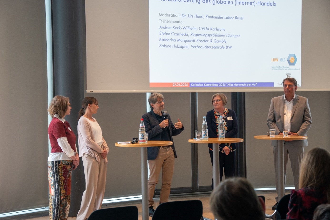 Abb. 4: Panel Talk 2, v.l.n.r.: Dr. Katharina Marquardt (Procter & Gamble), Sabine Holzäpfel (Verbraucherzentrale Baden-Württemberg), Dr. Urs Hauri (Moderator des Panel Talks, Kantonales Labor Basel Stadt), Andrea Keck-Wilhelm (Kosmetik-Team CVUA-Karlsruhe), Stefan Czarnecki (Abteilungsleiter der Marktüberwachung, Regierungspräsidium Tübingen)